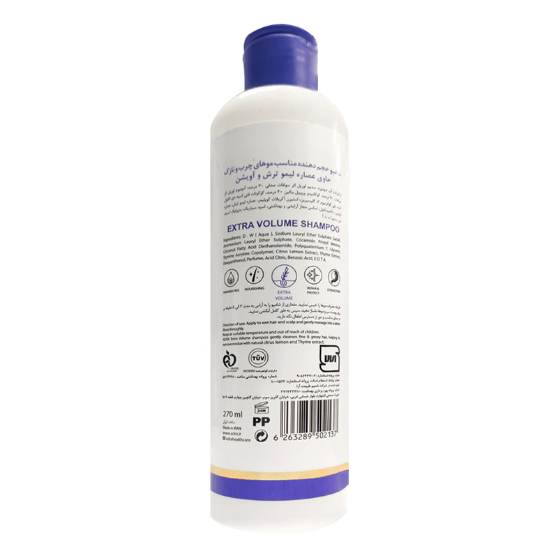 شامپو حجم دهنده و تقویت کننده مو آدرا، حاوی عصاره آویشن میباشد. این عصاره باعث تسریع گردش خون در پوست سر شده و این عمل فولیکولهای مو را به خوبی تقویت میکند، در نهایت موجب افزایش حجم و ضخامت تارهای نازک و ضعیف مو میشود. این شامپو مخصوص موهای چرب است و بلافاصله بعد از استفاده میزان ترشح چربی پوست سر را تنظیم کرده و در عین حال رطوبت مورد نیاز موها را هم تامین میکند.