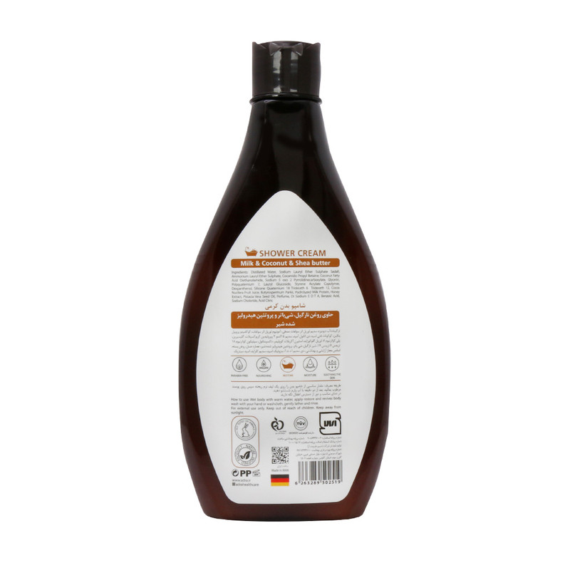 شامپو بدن کرمی حاوی روغن نارگیل، شی باتر و پروتئین هیدرولیز شده شیر آدرا، برای تمامی افراد با انواع پوست مناسب است.