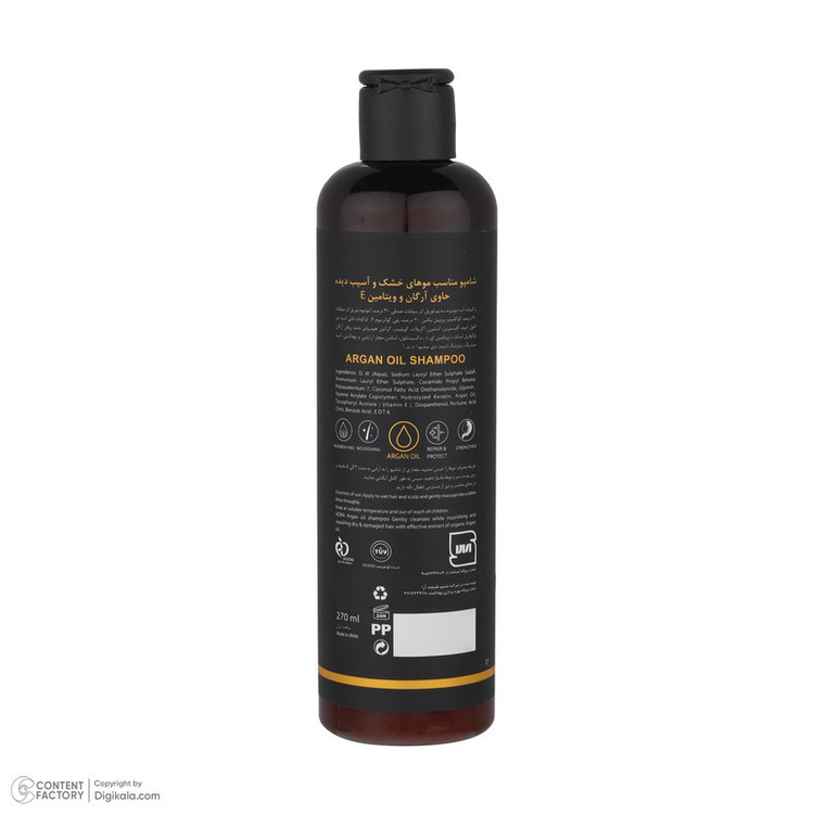آب دیونیزه، سدیم لوریل اتر سولفات صدفی 30 درصد، آمونیوم لوریل اتر سولفات 70 درصد، کوکامیدو پروپیل بتائین 30درصد، پلی کواترنیوم 7، کوکونات فنی اسید دی اتانول امیدف گلیسیرین، کراتین هیدرولیز شده، روغن آرگان، توکوفریل استات (ویتامین ای)، دکسپنتانول، اسانس مجاز آرایشی و بهداشتی، اسید سیتریک، بنزوئیک اسید، دی سدیم ا د ت ا.